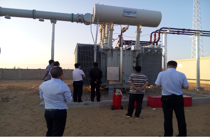 内蒙古风水梁地区正值风沙季节,进入六月以来,项目施工现场遭受了暴雨、冰雹、沙暴、高温等各种极端天气,施工条件极其恶劣。项目建设中对侧间隔及升压站施工是最关键的部分,对侧间隔的施工需要不断的协调地调及当地变电站,手续繁琐,工期紧张。基础开挖后又遭遇暴雨,因沙地地质多次垮塌。在升压站的施工过程中,站用电迟迟无法协调解决,调试工作不断拖延,于6月17日才正真开始调试工作,施工现场加班加点,连日熬夜调试终于在6月28日完成所有调试工作,并成功赶上了6.30这一关键时间节点。